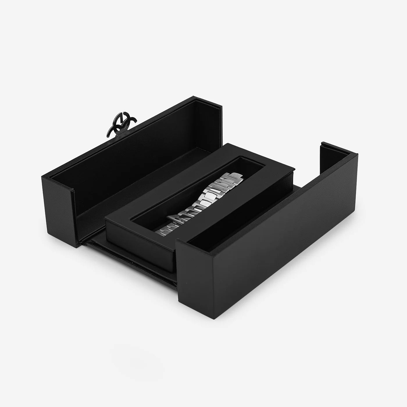 แต่ละสายของ Apple Watch ถูกนำเสนอในกล่องที่พิเศษไม่แพ้กับสิ่งที่อยู่ข้างใน ที่ผลิตด้วยมือด้วยความระมัดระวัง มีภายในที่ทำจากหนังสีดำที่งดงาม กล่องนี้ไม่ใช่แค่บรรจุภัณฑ์ แต่เป็นการยืนยันถึงความมุ่งมั่นของเราที่จะทำให้ Apple Watch strap ของคุณเป็นประสบการณ์ที่หลากหลาย